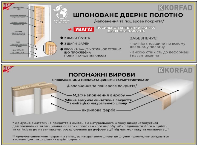 Производство осуществляется в Украине на фабрике Korfad Excellence в Черниговской области (г. Корюковка). Благодаря современному оборудованию и контролю качества двери отличаются стабильной геометрией, прочностью и надежностью в эксплуатации.