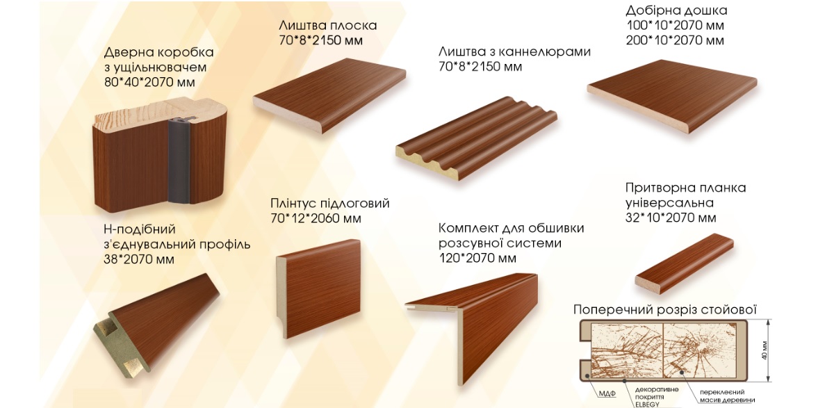 Основой для изготовления дверных полотен является склеенный массив сосны. Для придания несущим конструкциям дверей высокой жесткости и стабильности форм, они покрываются слоем листового МДФ, что также уменьшает микродеформации при резком изменении влажности в помещениях. Филенки изготовлены из МДФ, облицованы покрытием ELBEGY с 3D-эффектом под цвет и текстуру дерева.