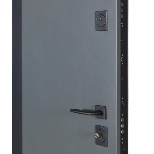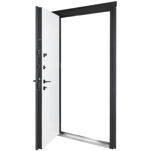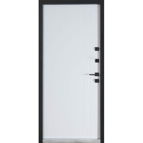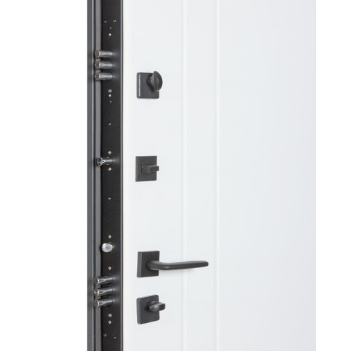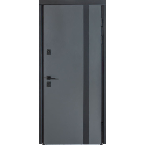 Дверне полотно | Товщина 95 мм, 7 ребер жорсткості, товщина металевого профілю 1,2 мм, сталевий лист 1 мм, захисні кармани для замків 1,2 мм, 3 конусні петлі (d-24/120 мм), 3 протизнімні ригелі (Ø14 мм), зовнішнє оздоблення — сендвіч-панель (метал 0,8 мм + ЕППС 20 мм, цинкогрунт, УФ-фарба), внутрішнє оздоблення — вологостійкий МДФ 16 мм з плівкою ПВХ Winshield (Ізраїль), металева лиштва (бокова 52 мм, верхня 71 мм, монолітна з коробом), торець фарбований у колір Metalic Black, теплоізоляція — базальтова вата 45 кг/м³ з фольгованим утеплювачем, 2 контури євроущільнювача. |