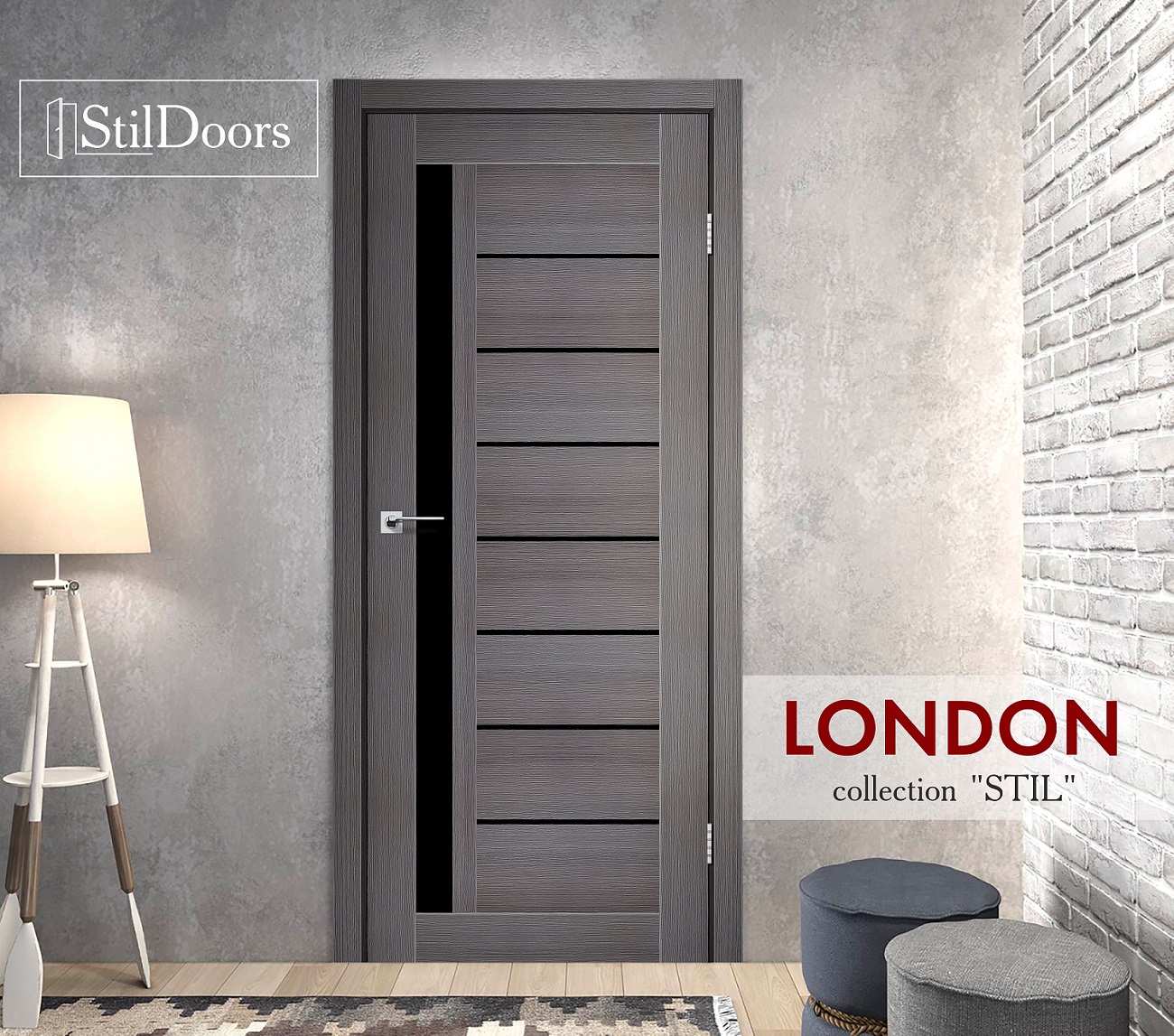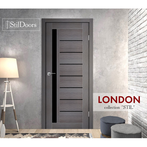 Опис " Міжкімнатні двері StilDoors LONDON Дуб Сріблястий зі склом сатин або чорним "