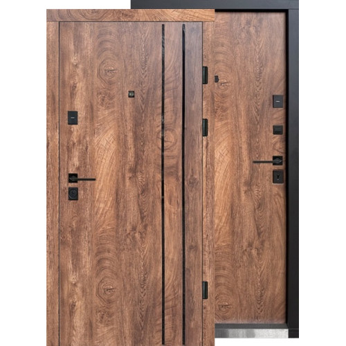 Полотно має товщину 95 мм з металом 1,2 мм, торець закритий МДФ, що підсилює стійкість до деформацій. Рама — із цільногнутого профілю 100 мм, товщина металу 1,4 мм, колір рами — чорний RAL 9005. Завдяки цій конструкції двері зберігають форму при активній експлуатації та підвищують рівень безпеки.