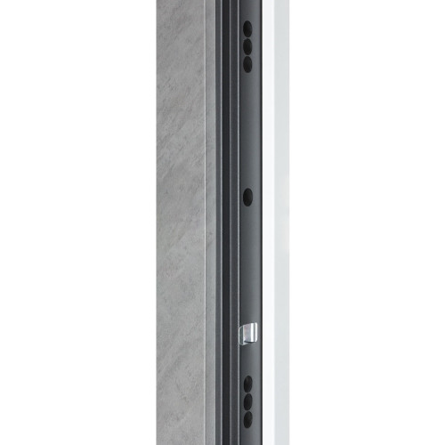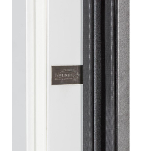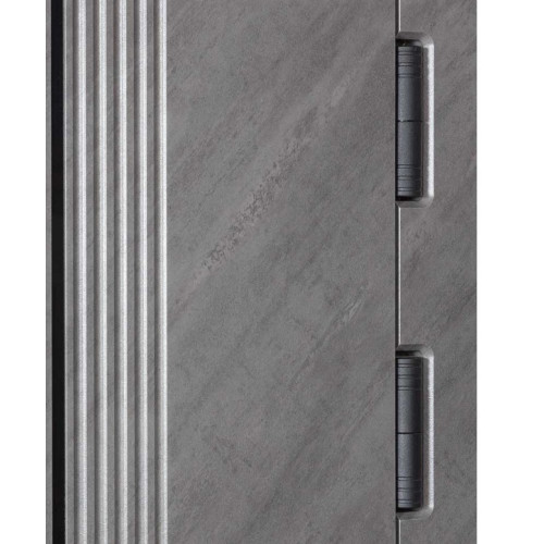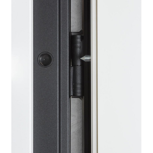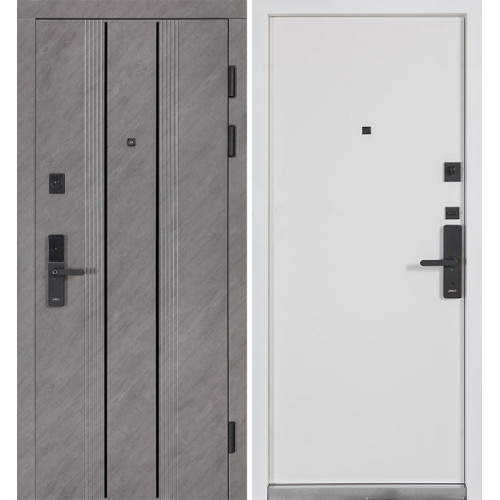 Двері виконані у стильному кольорі Зріз каменю/Білий матовий гладкий з ламінованим торцем полотна. Велика товщина лиштви (22 мм) дозволяє реалізувати ефект прихованого монтажу, створюючи єдину площину зі стіною. Конструкція включає 3 конусні петлі з підшипником, 3 протизнімні ригелі та нержавіючий поріг. Декоративне оздоблення виконано МДФ-плитами 16 мм / 16 мм.