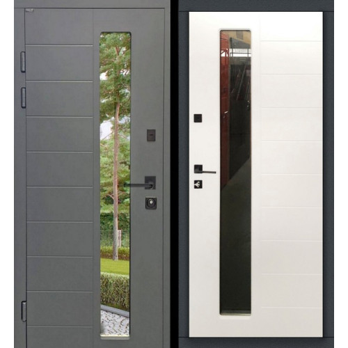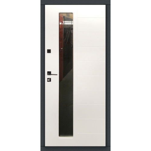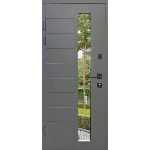 Склопакет додає моделі світла та візуальної легкості, при цьому зберігаючи захисні властивості дверей. У залежності від комплектації застосовується сатиновий склопакет з нержавіючою або чорною рамкою, а також варіанти зі скритим кріпленням лиштви.