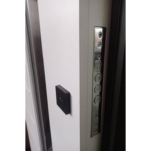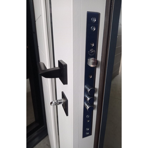 Двері комплектуються надійною замковою групою. У стандартних версіях використовуються замки CLASS 257 та CLASS 252, у розширених комплектаціях — KALE 257 та KALE 252 з циліндром CORDON TECH чорного кольору. Три посилені петлі забезпечують плавне відкривання та довготривалу експлуатацію навіть при великій вазі полотна.