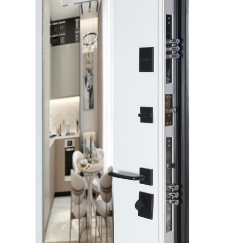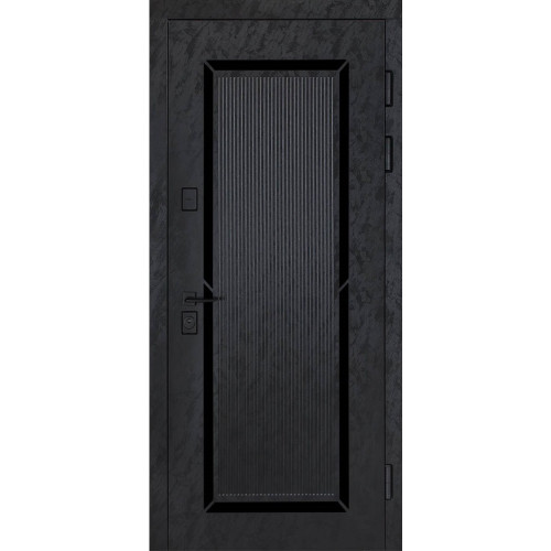 Двері комплектуються квадратною чорною фурнітурою, ручкою Smart Квадро, мають стриманий вигляд і добре поєднуються з сучасними під’їздами та квартирними коридорами.