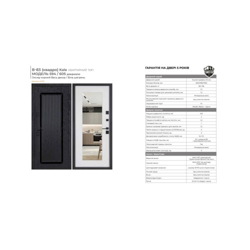 Вхідні двері В-83 модель 594 / 605 — це надійне рішення для квартири, де поєднані підвищена безпека, сучасний дизайн та практичність у щоденному користуванні. Модель оснащена дзеркалом з внутрішньої сторони, що візуально розширює простір і додає інтер’єру функціональності без шкоди для міцності конструкції.