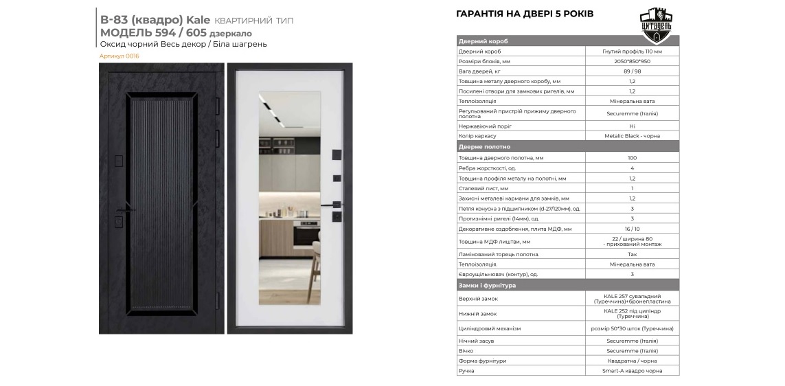 Модель В-83 — це оптимальний баланс між ціною, безпекою та дизайном. Вона підходить для більшості квартирних проєктів, не потребує доопрацювань і готова до встановлення одразу після доставки. Дзеркало, посилена конструкція та замки KALE роблять ці двері практичним вибором на роки.