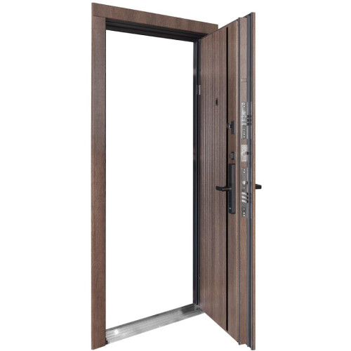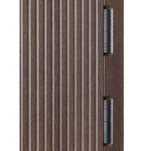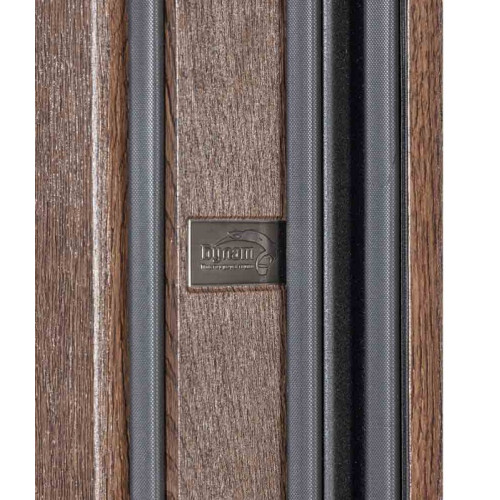 Двери выполнены в стильном цвете Дримвуд темный с ламинированным торцом полотна. Большая толщина наличников (22 мм) позволяет реализовать эффект скрытого монтажа, создавая единую плоскость со стеной. Конструкция включает 3 конусные петли с подшипником, 3 противосъемные ригели и нержавеющий порог. Декоративная отделка выполнена МДФ-плитами 16 мм / 16 мм.